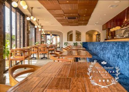 Dirígete al Fukugiya Cafe en la dirección: Japón, 〒904-0115 沖縄県中頭郡北谷町美浜9−12 アメリカンデポビルC 館 1F FUKUGIYA CAFE(ふくぎやカフェ). El teléfono es el 989368838 y la página web es fukugiya.com.